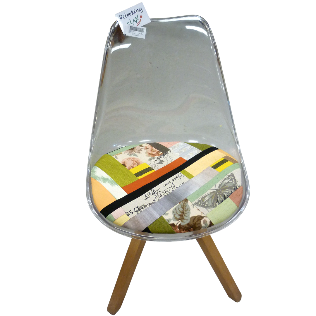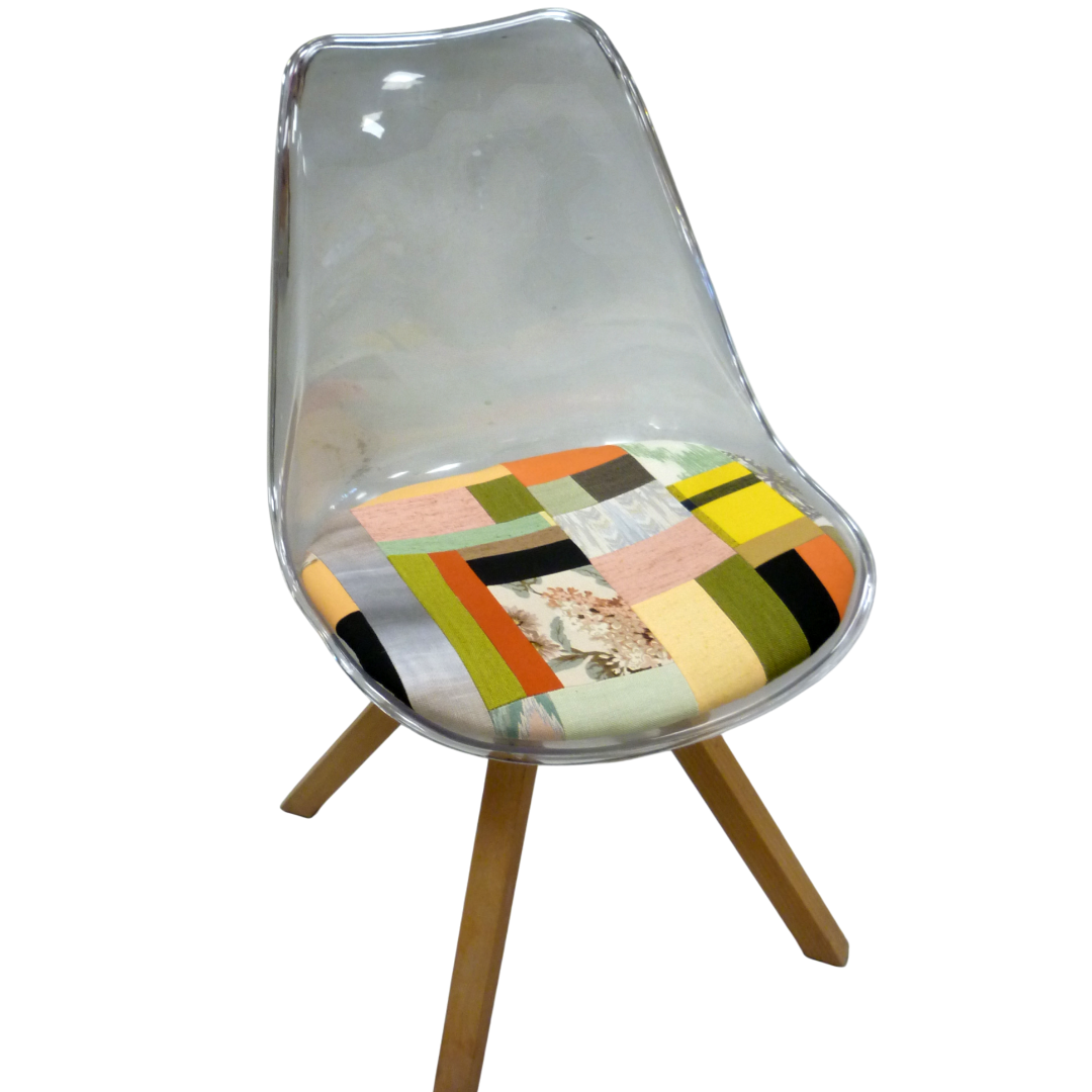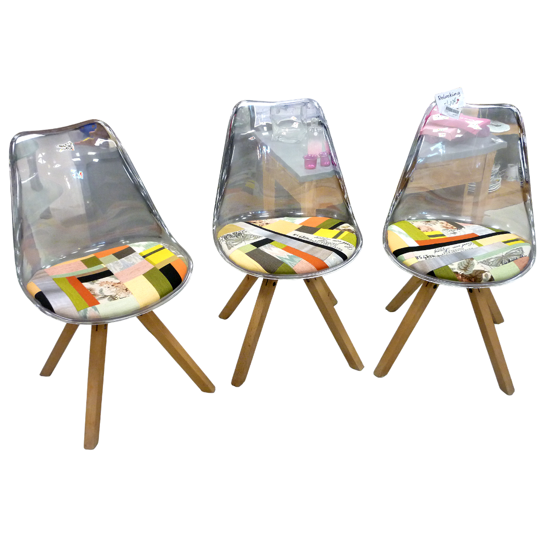 Lot de 3 chaises en plexiglass, assises relookées patchwork, made in ELAN