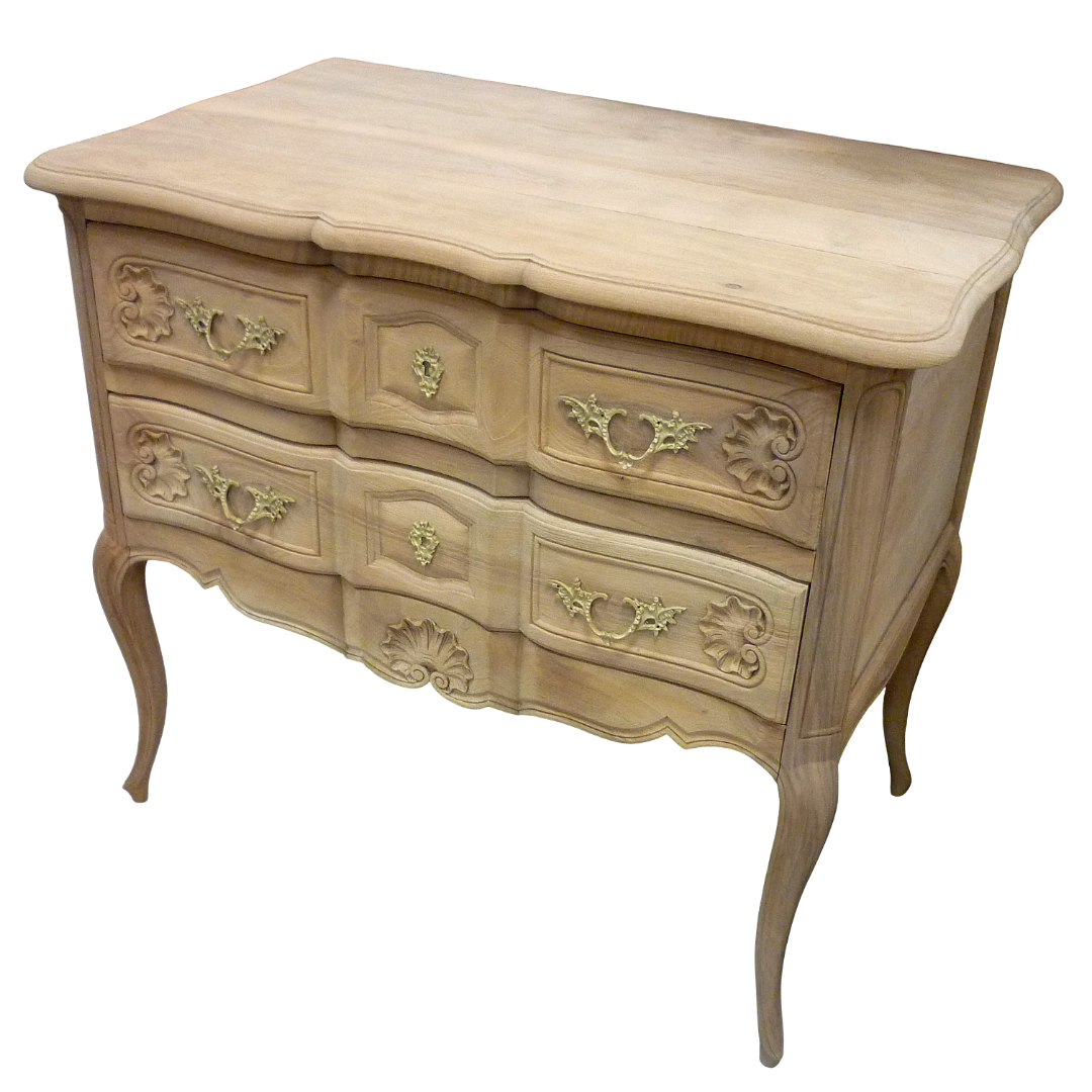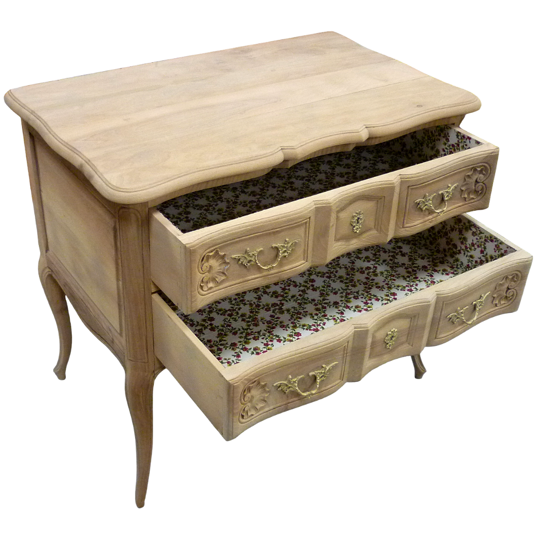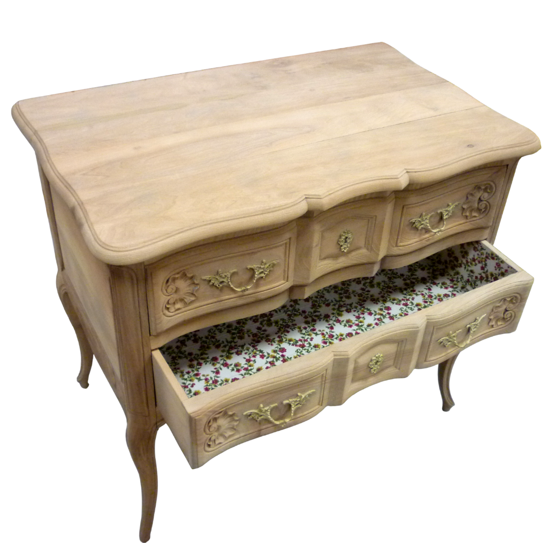 Commode de style Louis XV à deux tiroirs, en bois massif, entièrement aéro-gommée, révélant l’élégance naturelle de ses courbes et de ses pieds galbé.