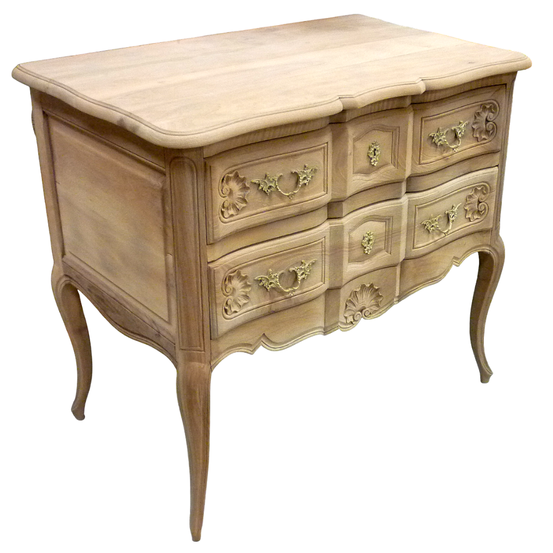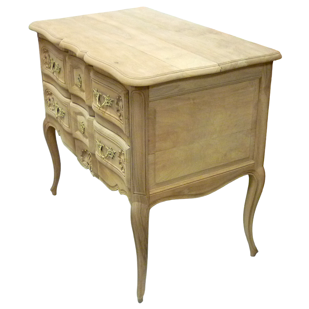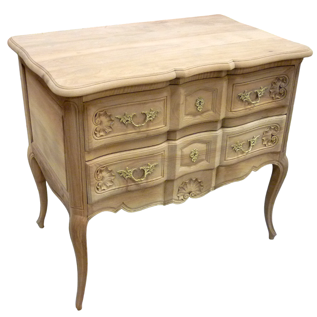 Commode de style Louis XV à deux tiroirs, en bois massif, entièrement aéro-gommée, révélant l’élégance naturelle de ses courbes et de ses pieds galbé.