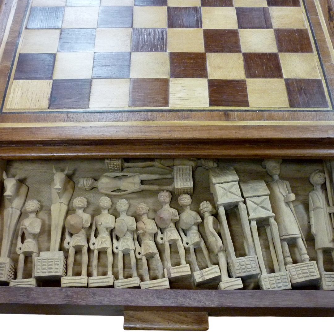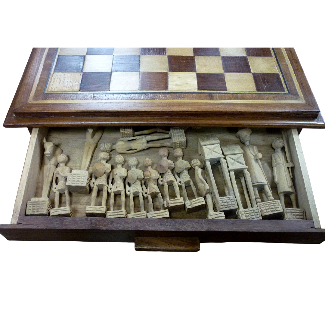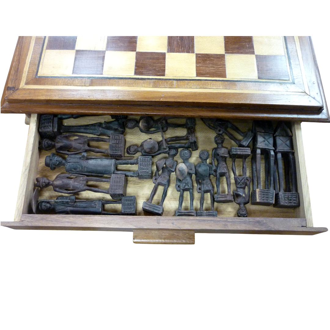Très beau plateau de jeu d’échecs africain en bois, avec tiroirs pour les pièces finement sculptées