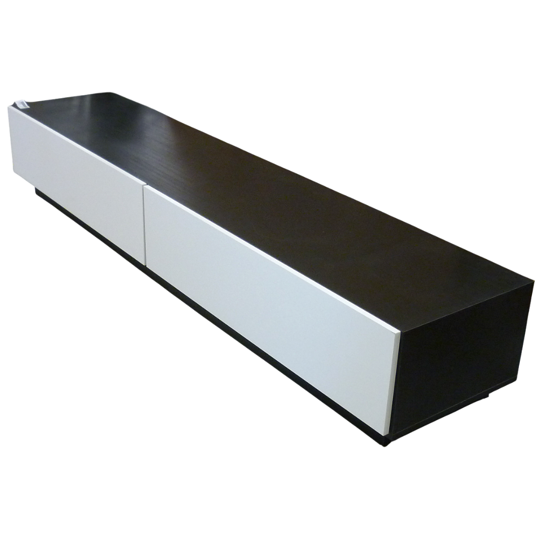 Long meuble TV noir et blanc laqué ; un coin peu visible abimé, au fond gauche en bas (voir photo)