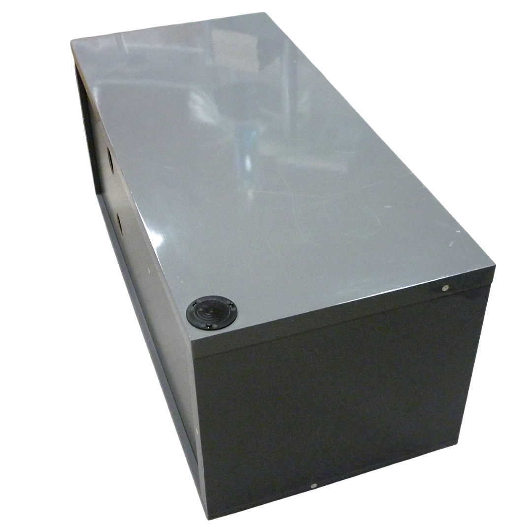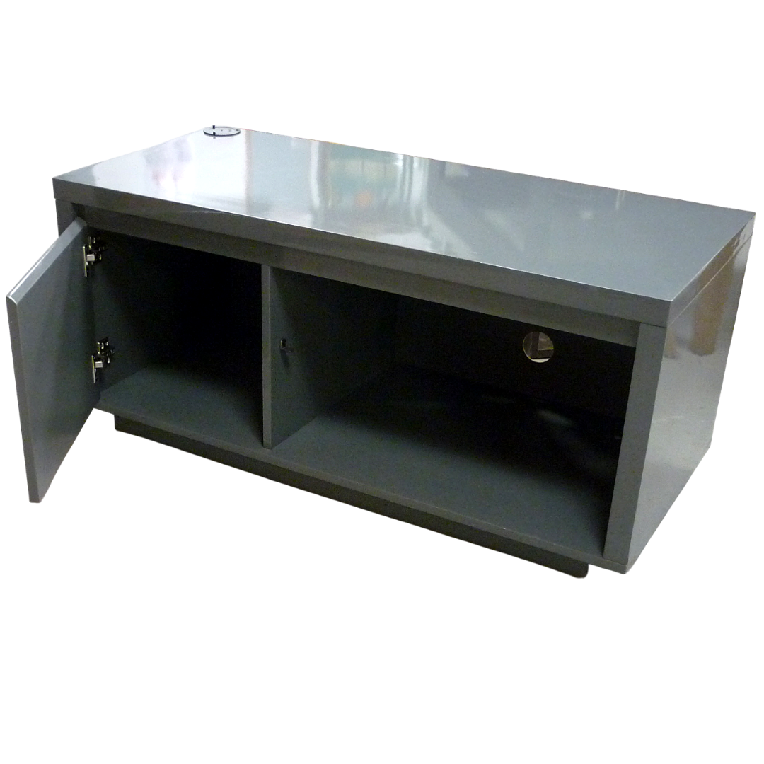Meuble TV mélaminé gris laqué, plateau présentant des traces d’usage