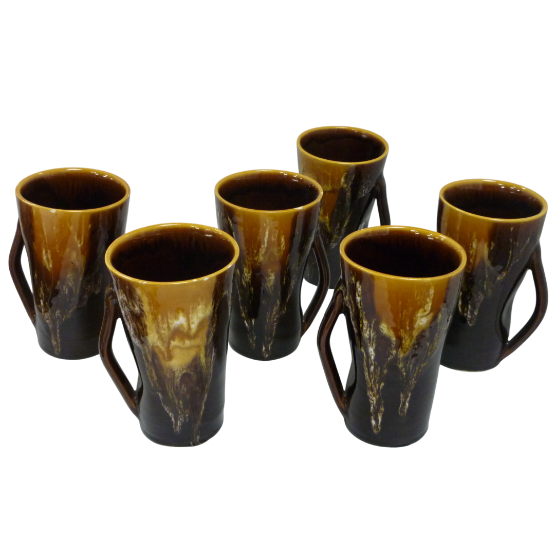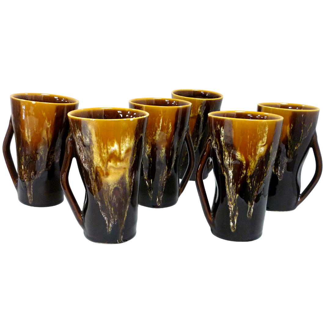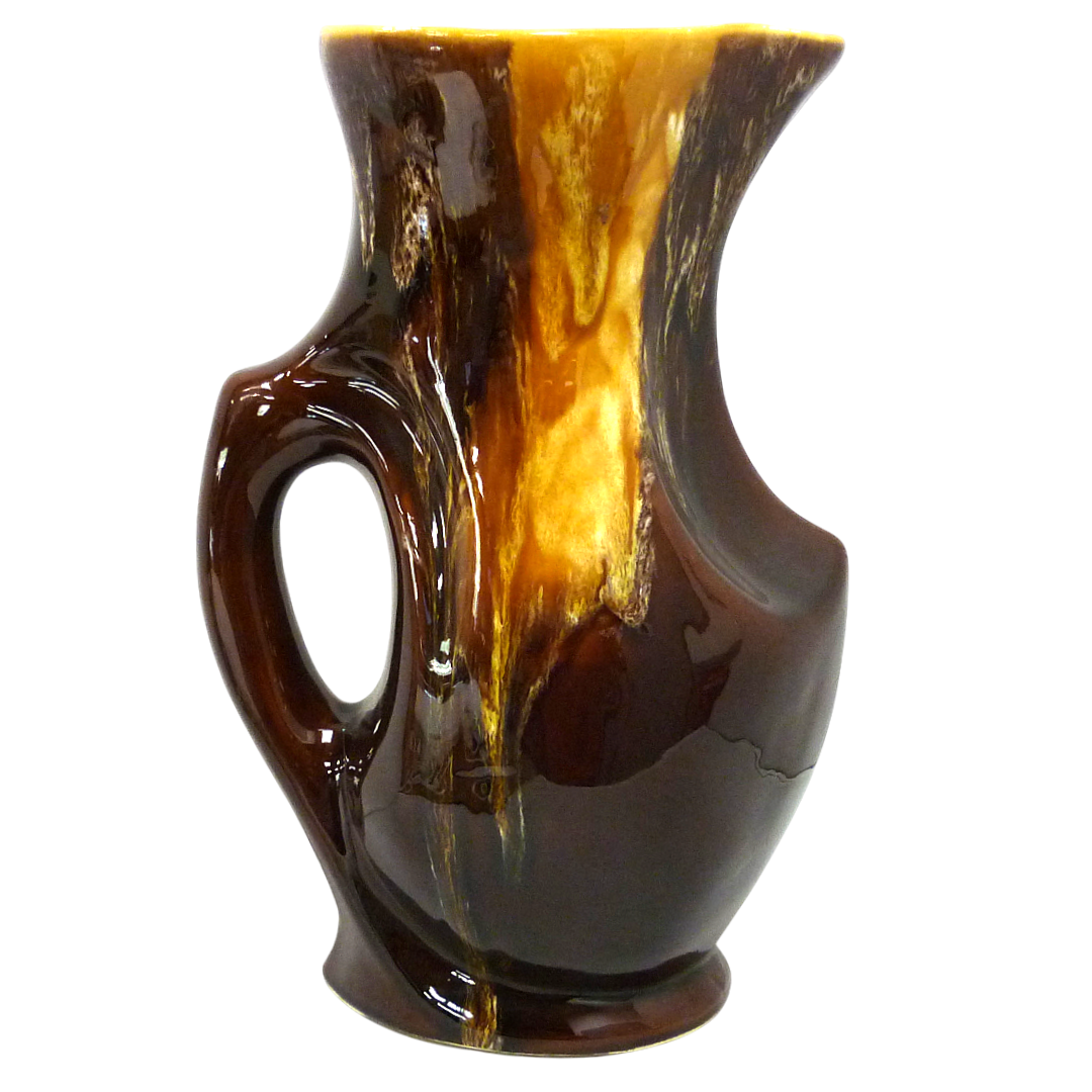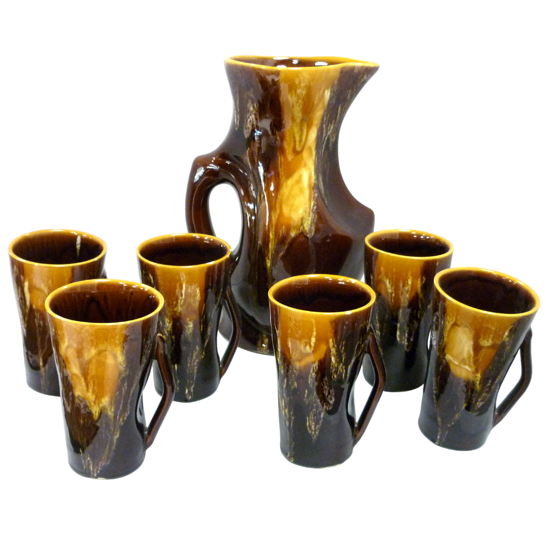 Beau service à orangeade vintage en faïence émaillée de Vallauris, dans les tons marron et jaune ocre des années 1960 :