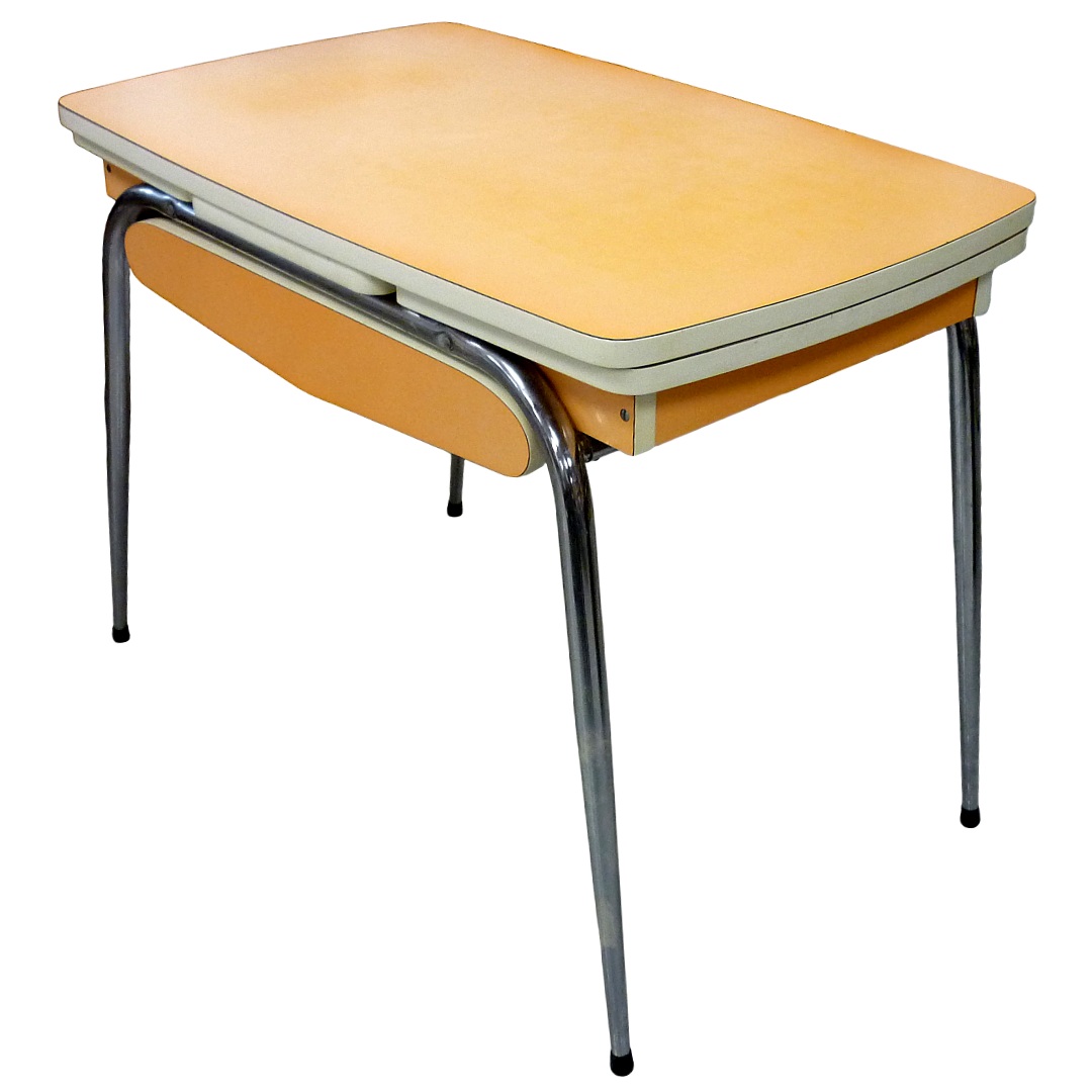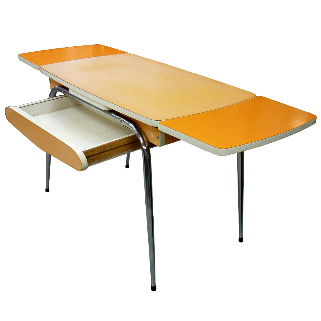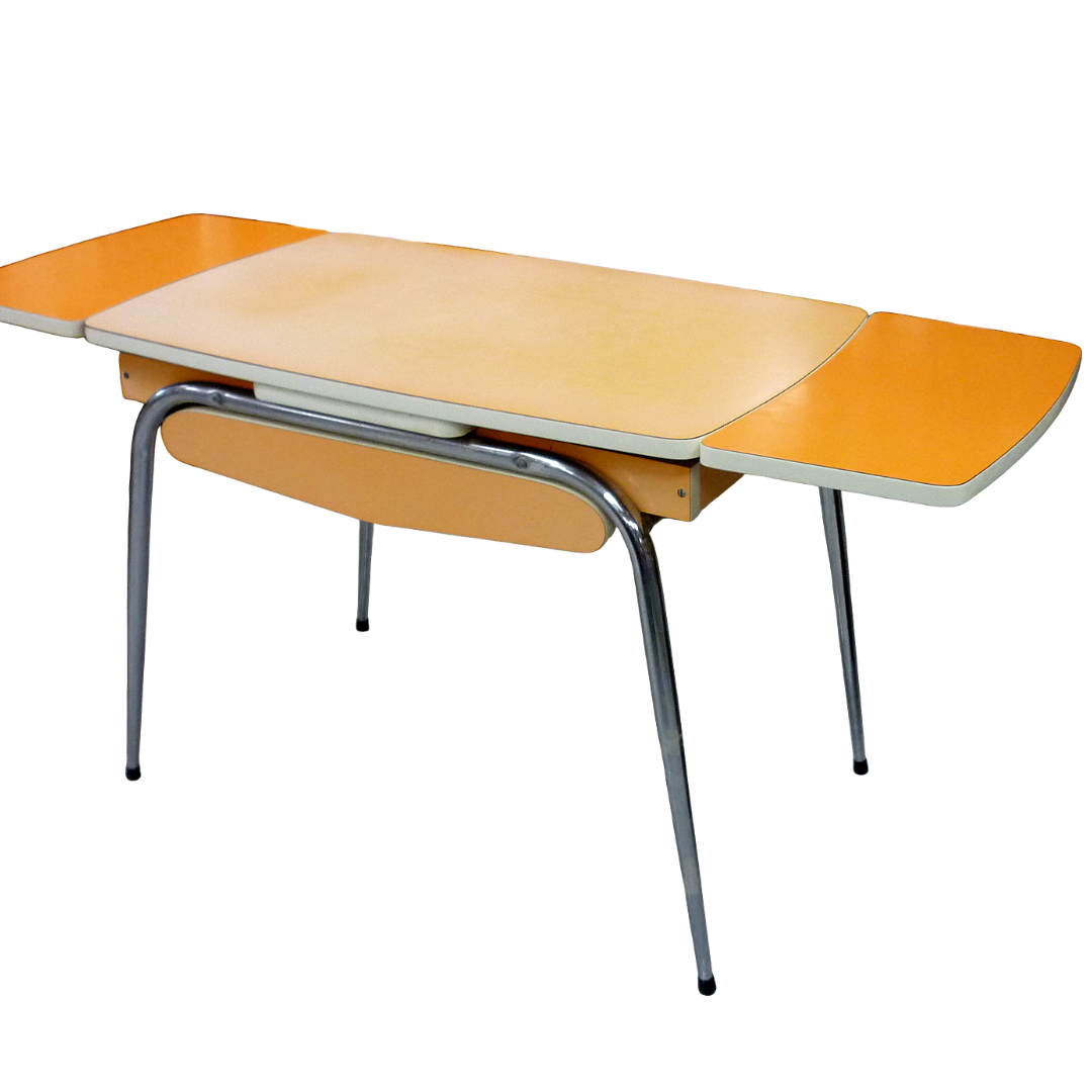 Table en formica orange, à rallonges (2 X 30 cm), avec un grand tiroir et une planche à découper intégrée, en très bel état général