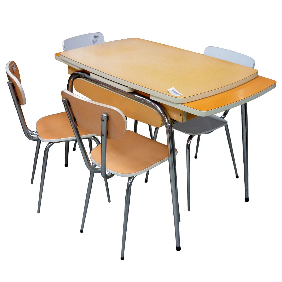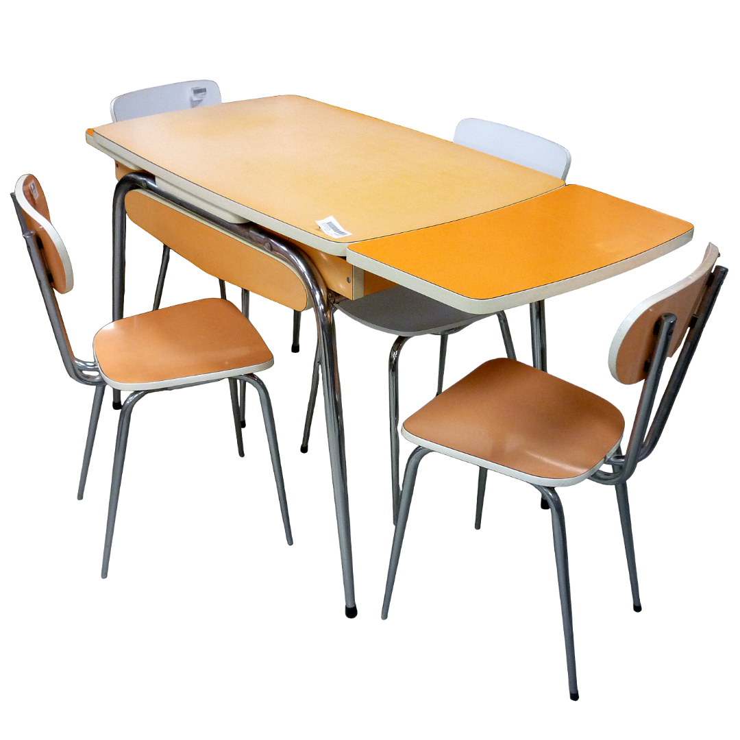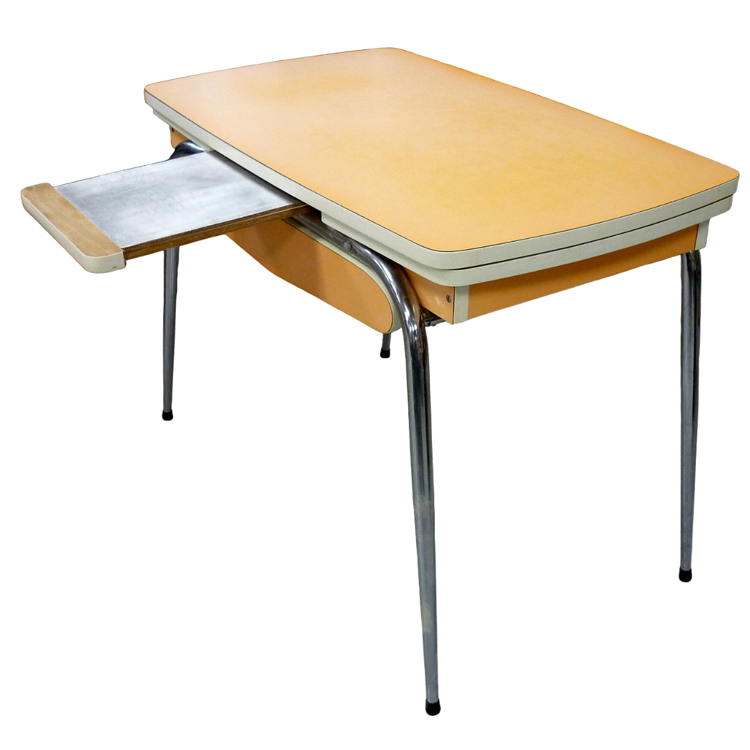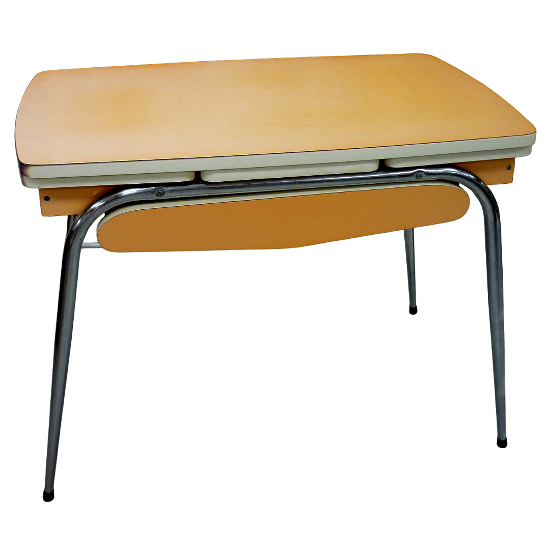 Table en formica orange, à rallonges (2 X 30 cm), avec un grand tiroir et une planche à découper intégrée, en très bel état général